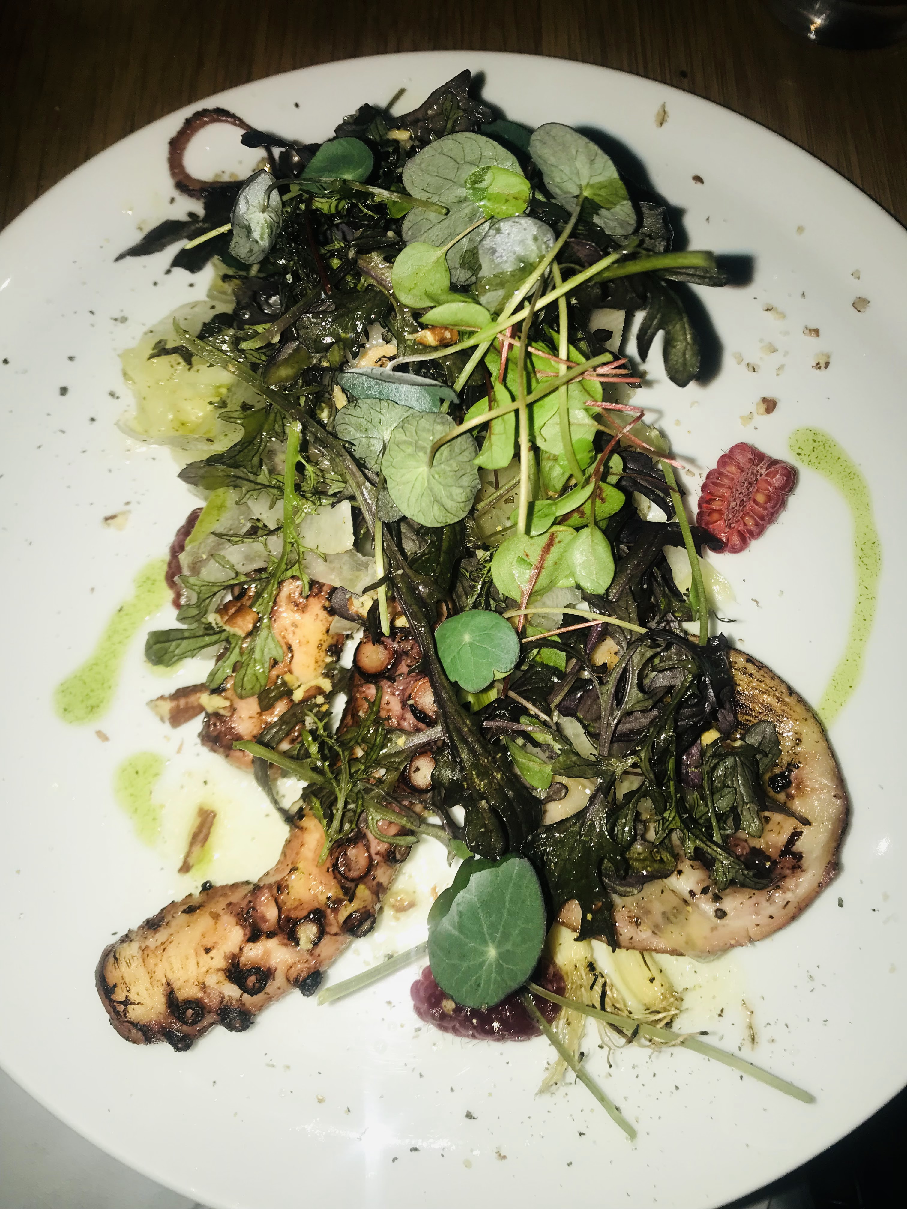 Entrées sans grand intérêt. Poulpe tres bien cuit, mais un peu trop salé, comme l'ensemble des plats que nous avons goûtés. Excellent fromage mais les desserts ne sont pas une priorité sur la carte...