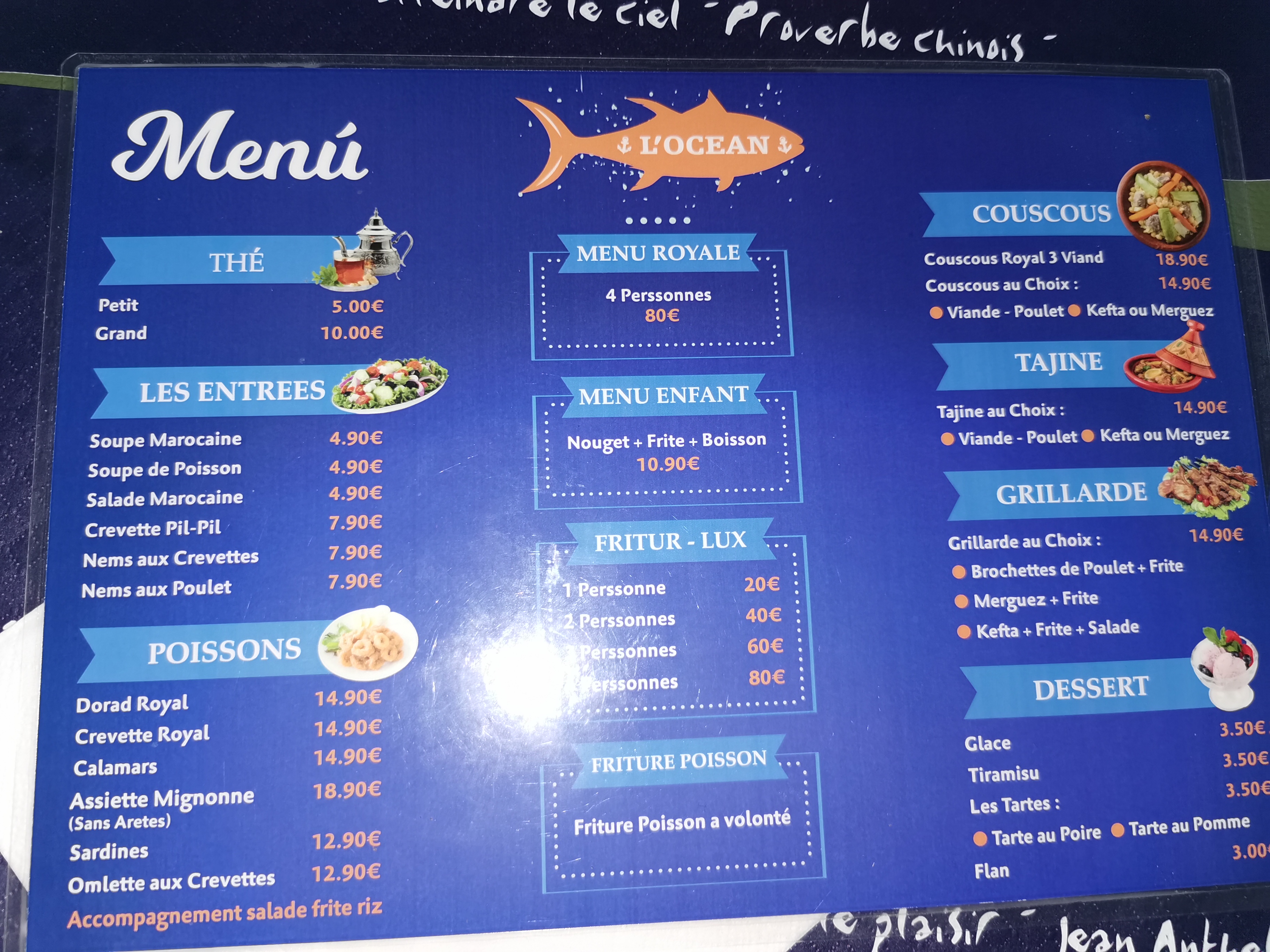 L'océan c pour les amateurs de poisson c restaurant magnifique en famille sûr tous la soupe marocaine et la friture de poisson c comme au bled ou bien chez la pêcherie je vous conseille fortement