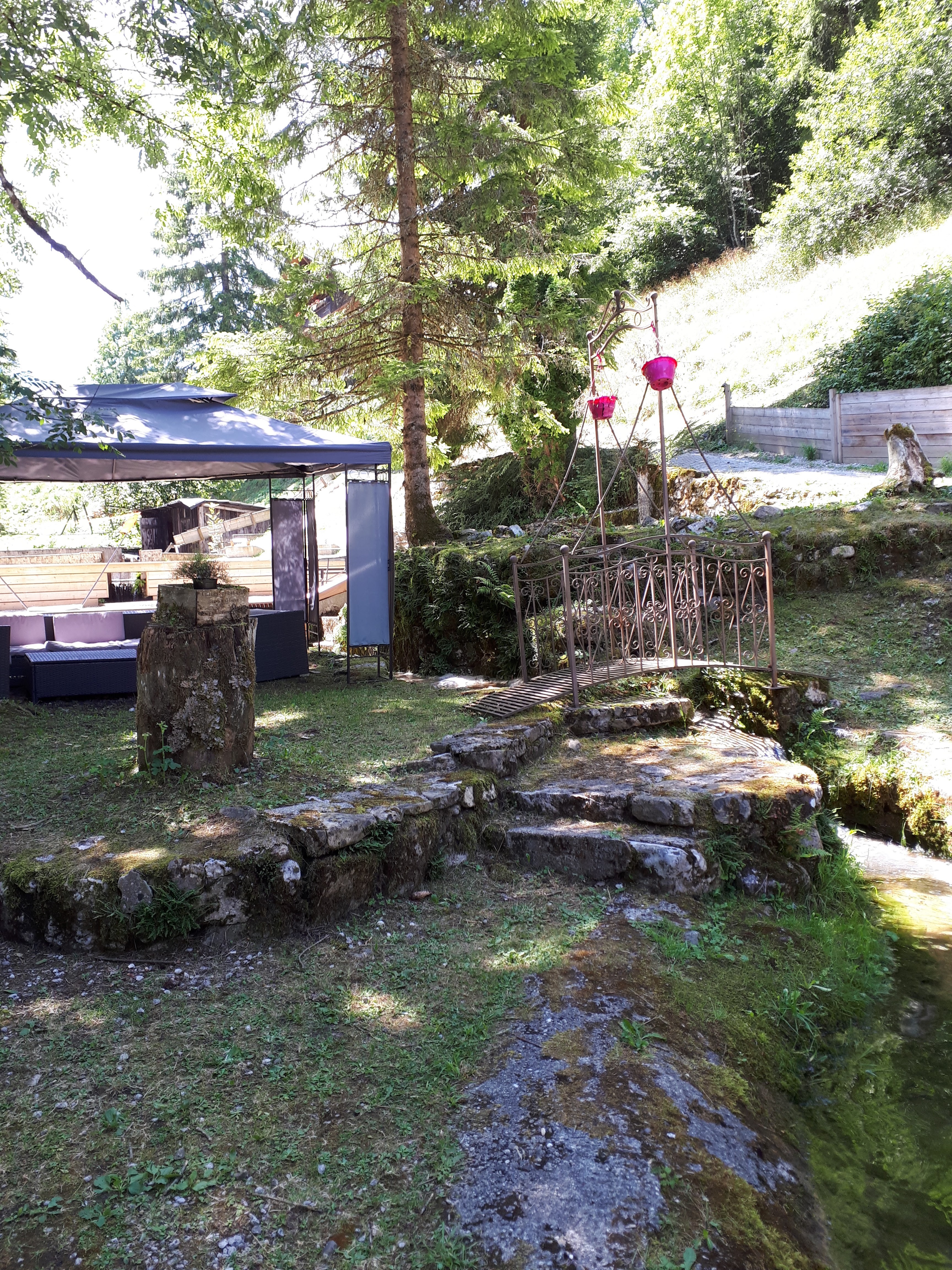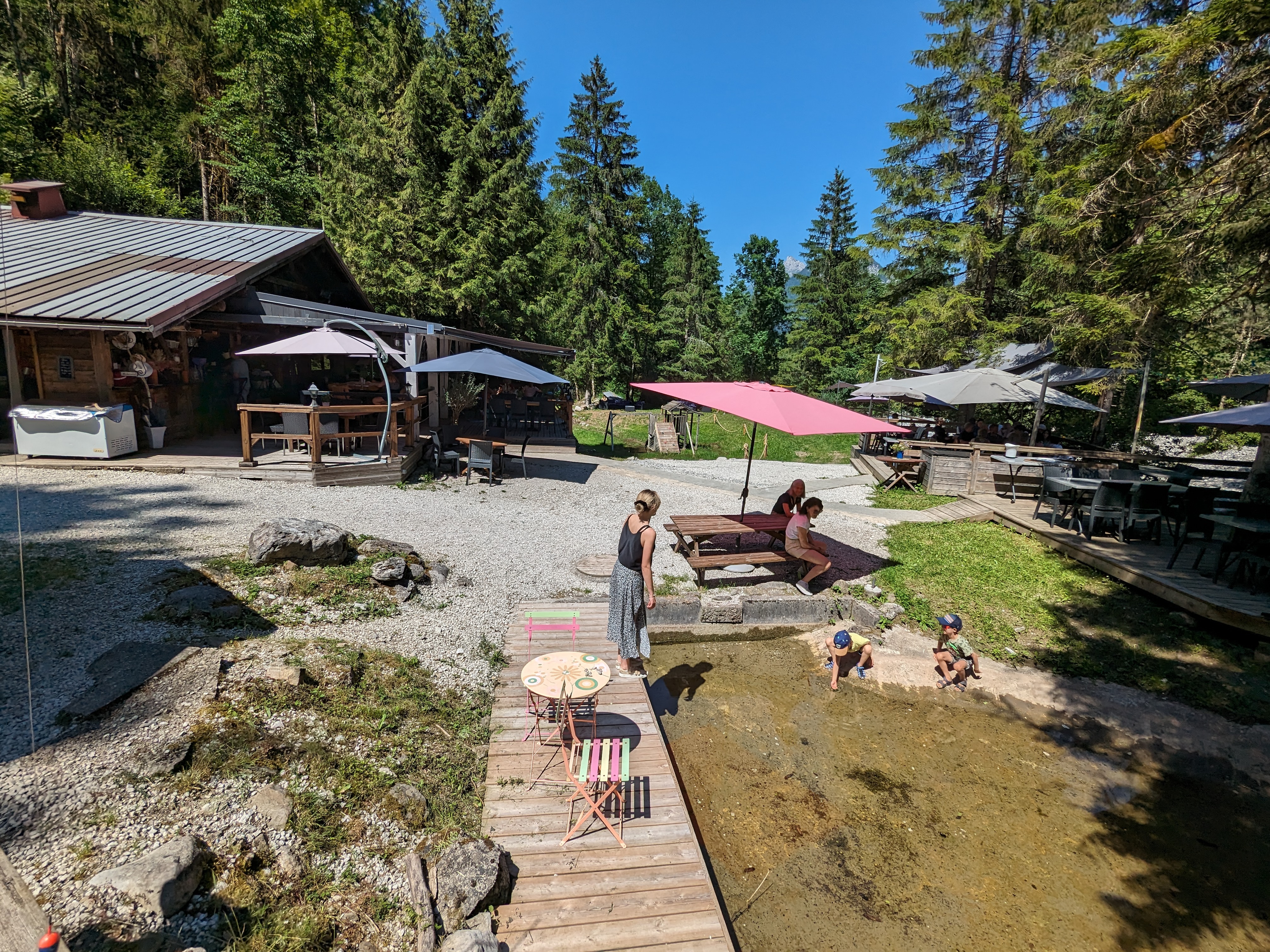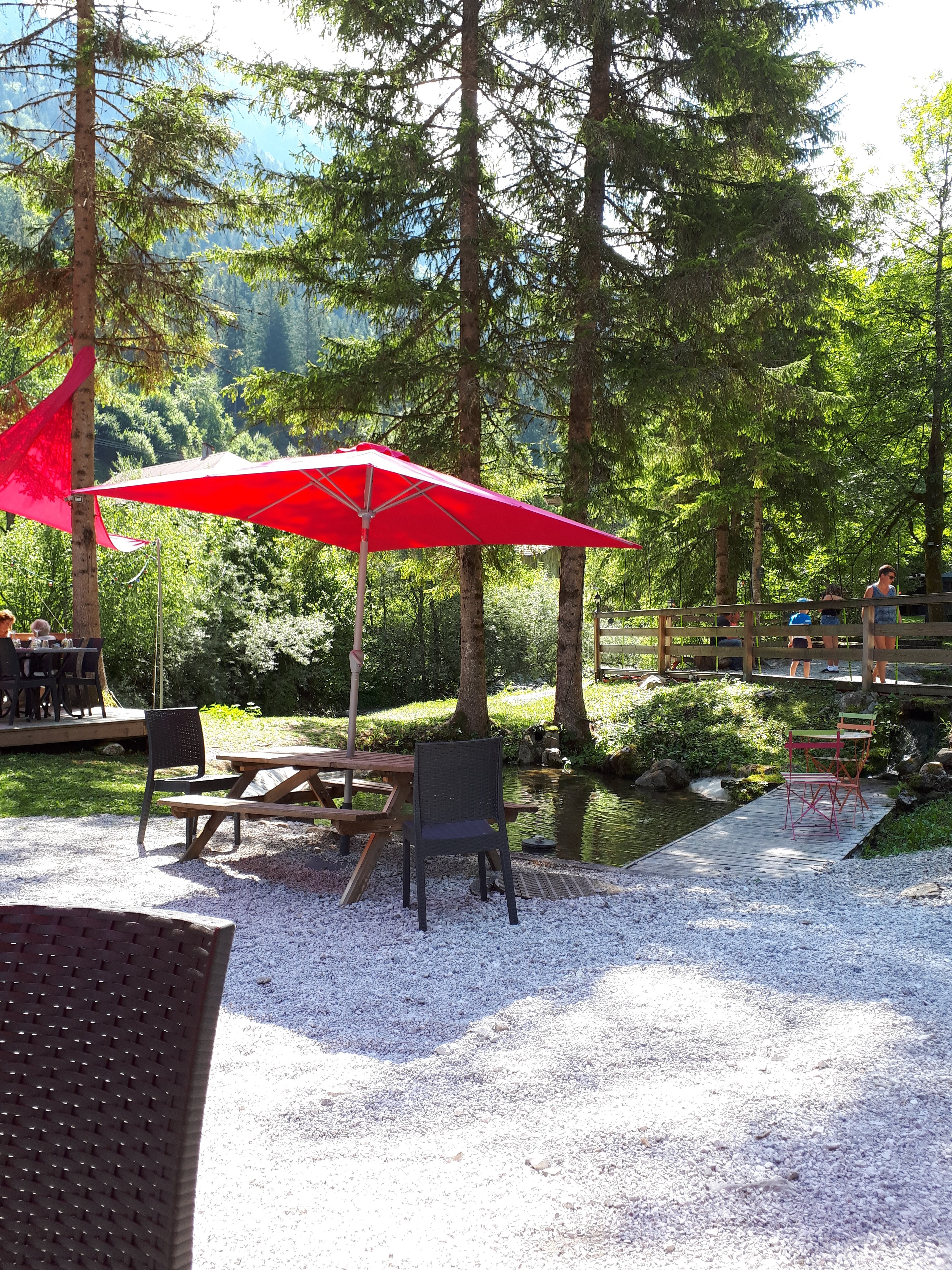 Voilà un espace parfait pour ce restauré et profiter de cadre. Il y a les truites et les enfants sont ravis de pouvoir les péché mais aussi profiter des jeux mis à disposition Pour des très jeunes enfants attention aux plans d'eau et au torrent... Concernant le rapport qualité prix, très bon mais je trouve un peu cher mais nous sommes en haute savoie !( 2 menus plat +dessert, 2 verre de blanc+ 1 menu enfant ) 74 euros. J'aurais été sensible au montant psychologique de 69 euros :)... Prestations service très bien nous avons eu droit à la tapenade maison avec notre verre de vin. Le menu enfant à l'avantage d'être autre chose que de la saucisse frites