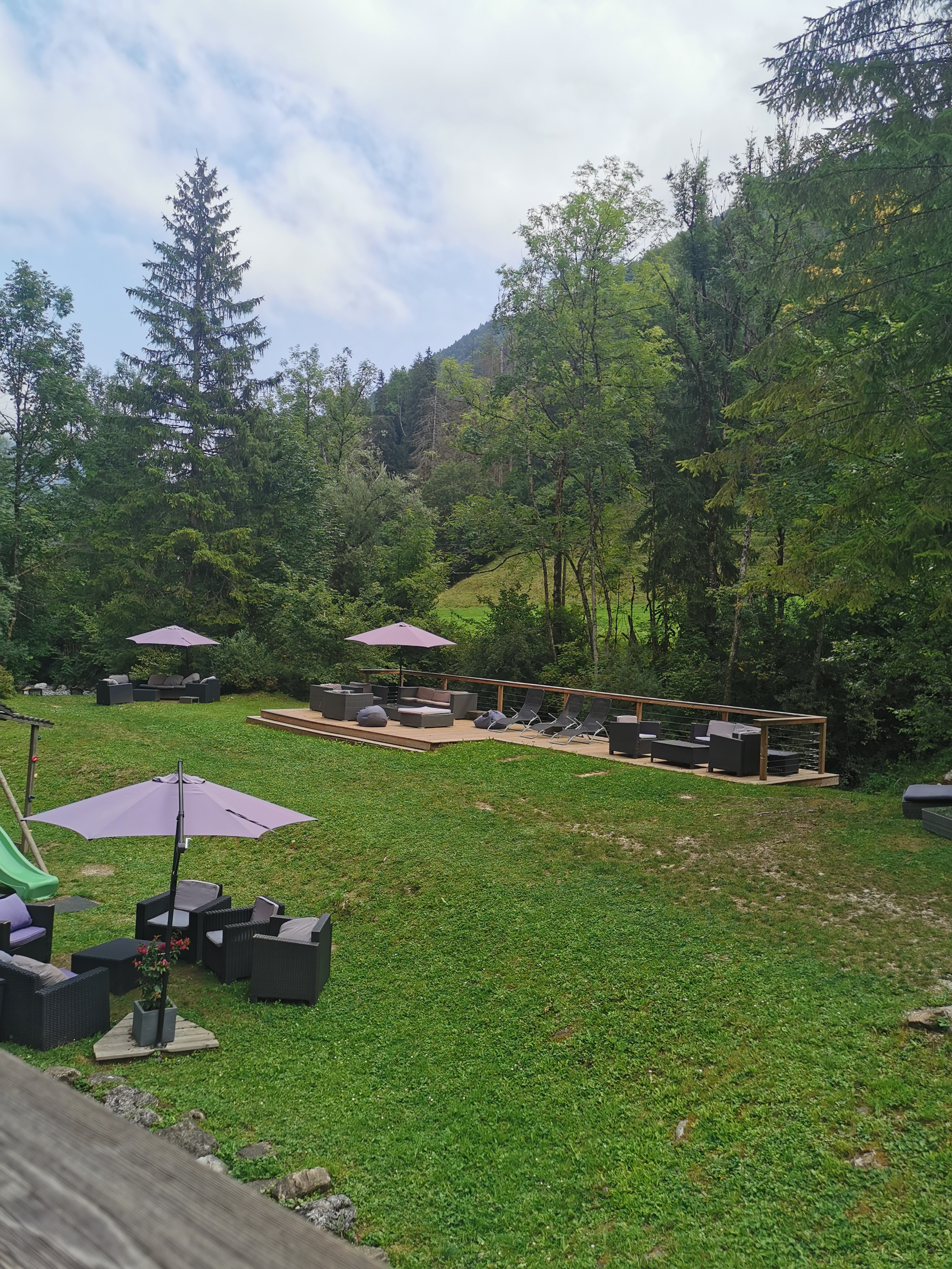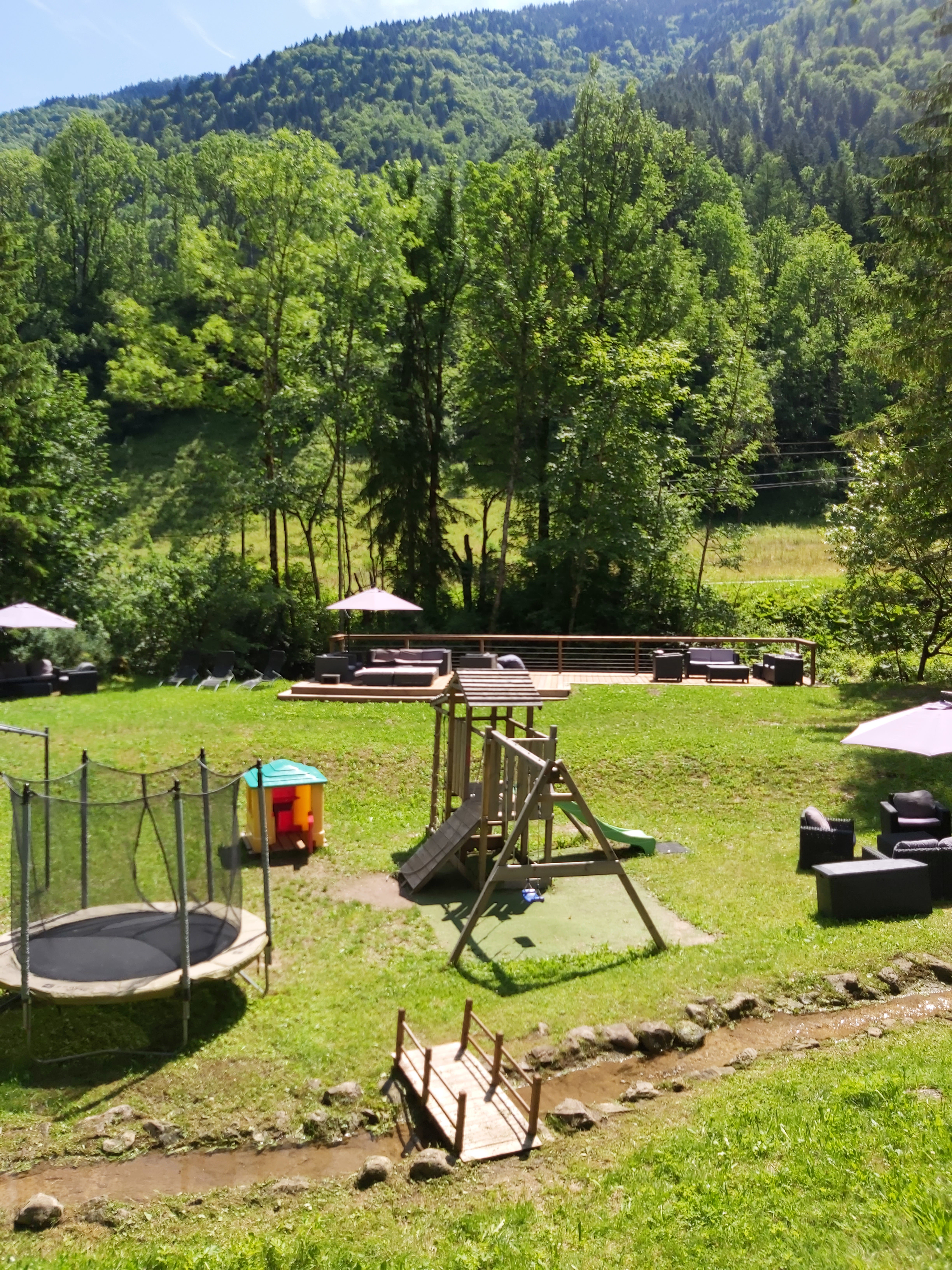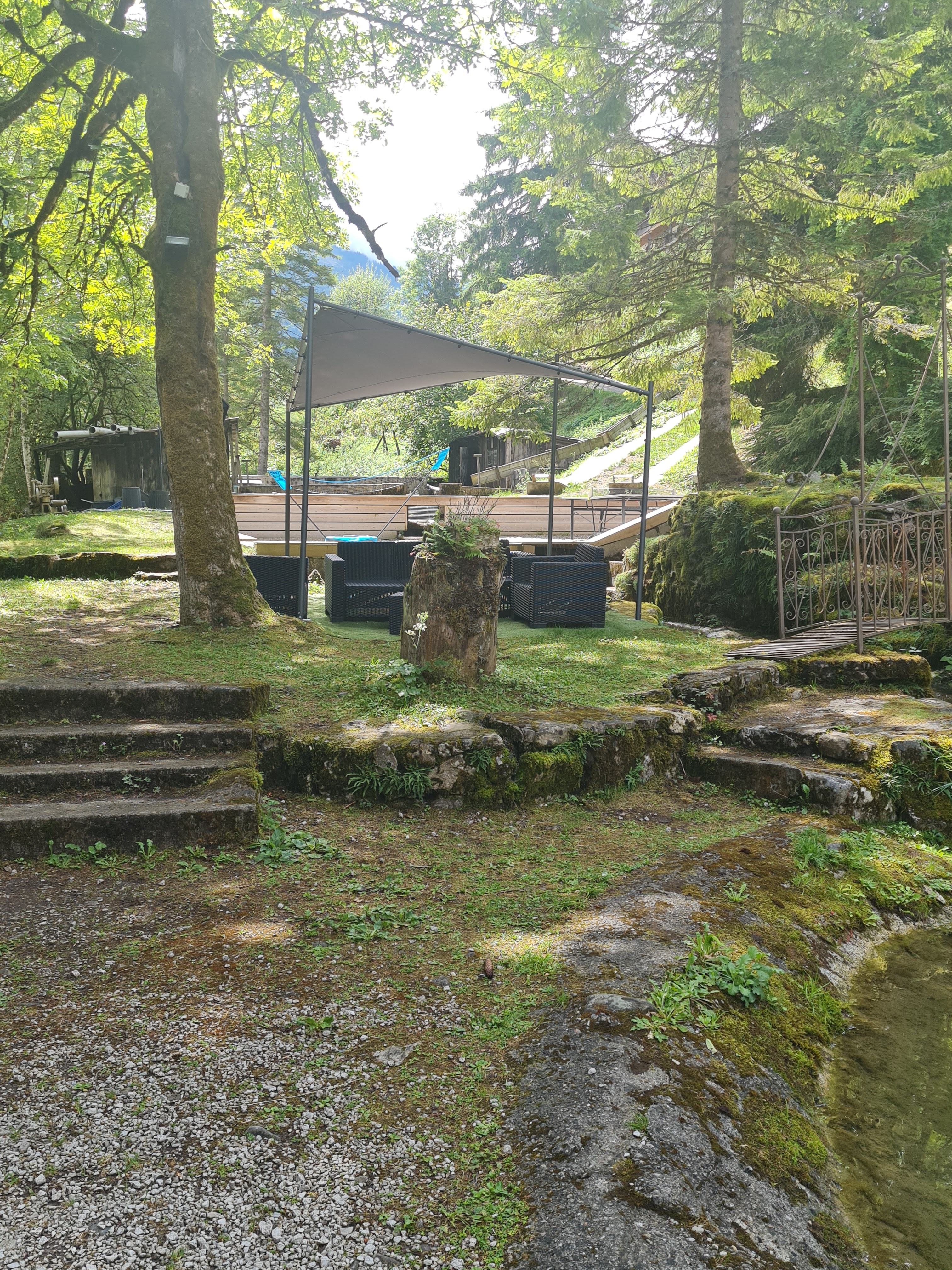 Voilà un espace parfait pour ce restauré et profiter de cadre. Il y a les truites et les enfants sont ravis de pouvoir les péché mais aussi profiter des jeux mis à disposition Pour des très jeunes enfants attention aux plans d'eau et au torrent... Concernant le rapport qualité prix, très bon mais je trouve un peu cher mais nous sommes en haute savoie !( 2 menus plat +dessert, 2 verre de blanc+ 1 menu enfant ) 74 euros. J'aurais été sensible au montant psychologique de 69 euros :)... Prestations service très bien nous avons eu droit à la tapenade maison avec notre verre de vin. Le menu enfant à l'avantage d'être autre chose que de la saucisse frites