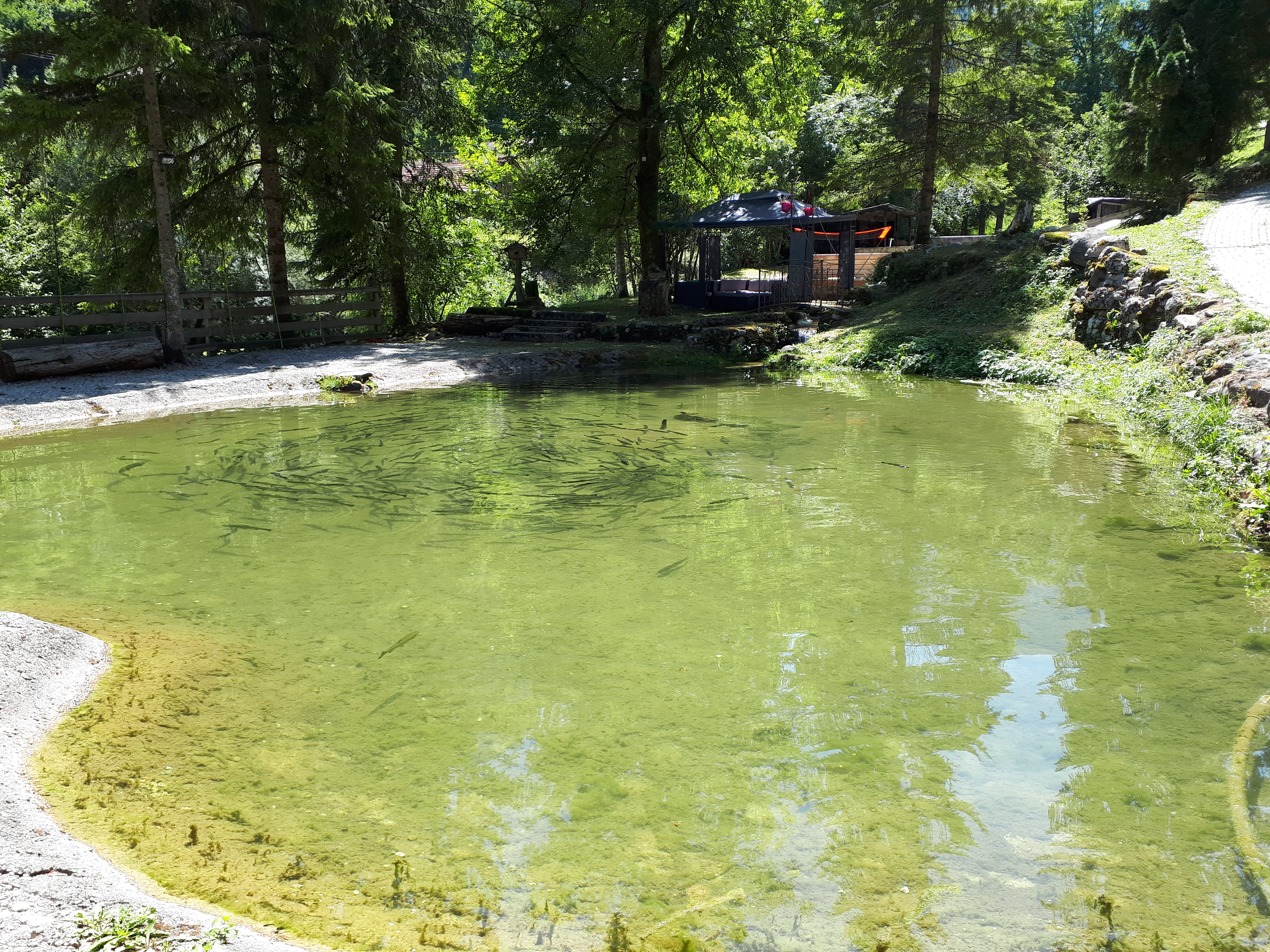 Cet endroit est tjs aussi exceptionnel que dans mon enfance, le cadre est paradisiaque avec l'herbe verte, les bassins de truite, les montagnes et le fleuve qu'on entend... Magnifique merci