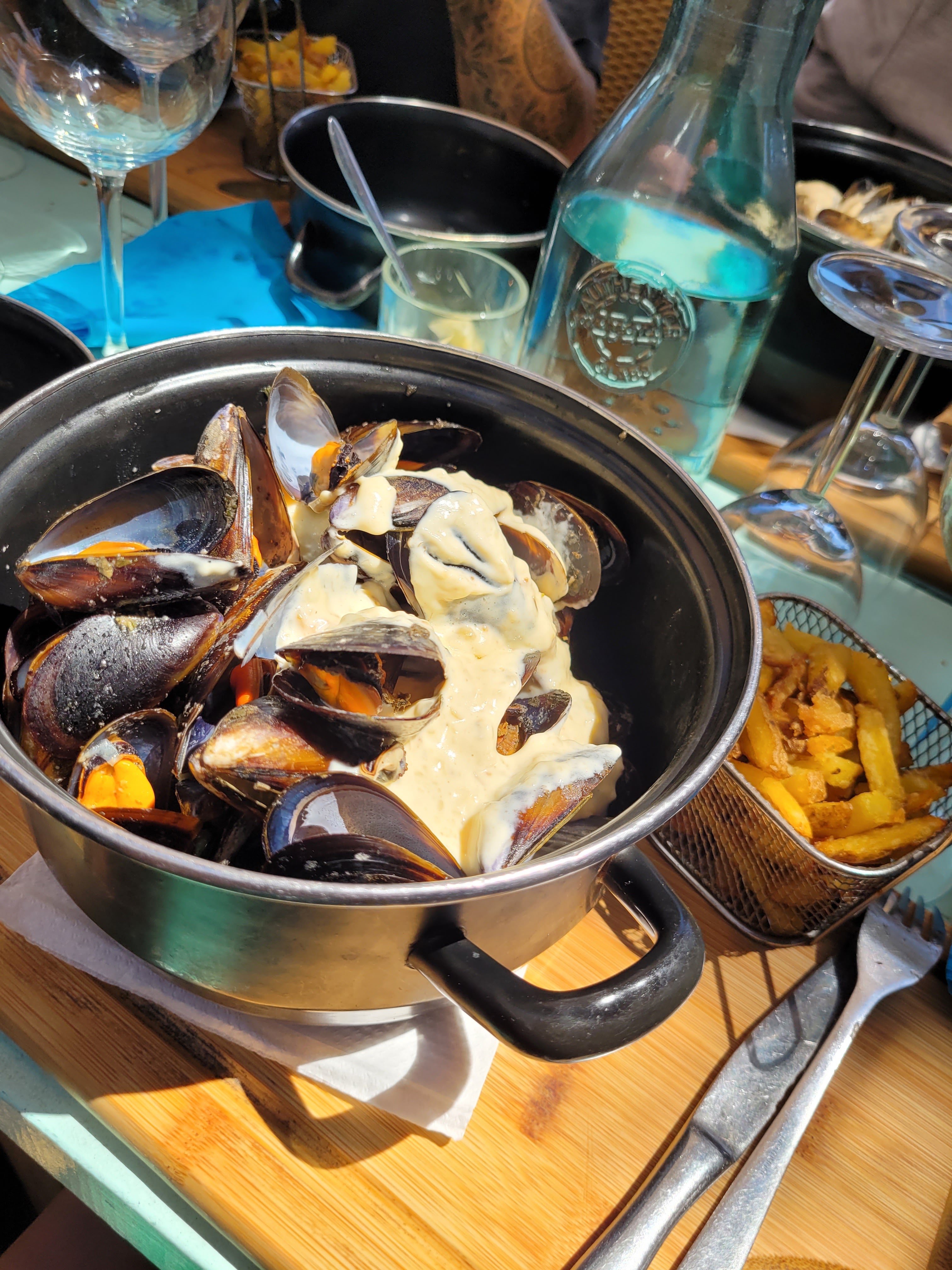 Arrivé le soir vers 19h20 , bien placé , la musique très bien réglé , la décoration est géniale et très originale , service un peu lent mais la cuisine compense , la réputation des moules frites est bien fondé et légitime , manque de poisson à la carte malgré l’emplacement près de la mer , sinon la dorade est bonne . Si vous pouviez me dire si prendre une boisson est une tradition car le serveur avait l’air surpris que l’on en prenne pas . Je recommande pour passer une bonne soirée et surtout pour manger des moules frites 😋