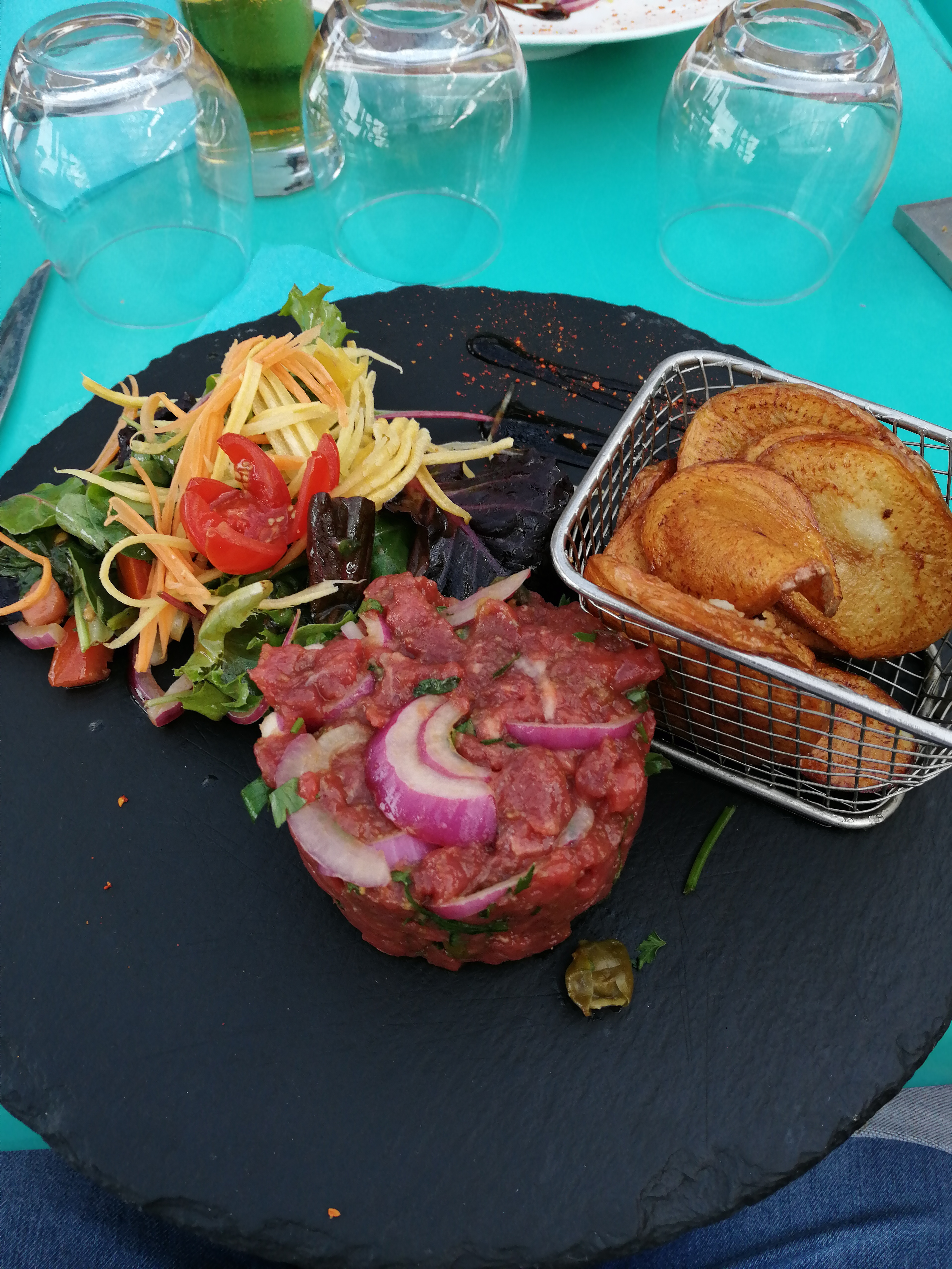 Tres bon Accueil de la part d'un jeune qui semble cadrer le reste de la troupe et qui essaiera tout au long du repas d'apporter de la satisfaction et corriger le manque de sérieux, dynamisme et professionnalisme de ses collègues en cuisine ou au service. Les frites n'arrivent pas en même temps que les tartares: il faut relancer la demande . Le pain n'arrive pas non plus. La coupe au couteau des tartares doit être faite à la hache tellement les morceaux sont gros. Le cuistot est parti fumer...on ne peut pas lui en vouloir il y a un temps pour tout. La salade ( plat principal) était ridicule: beaucoup de salade , peu de composants, sauce légère et fade. La table est tellement poisseuse/collante que la serviette de table se dechire en la retirant et des morceaux sont restés collé dessus. Ce n'était pas notre première fois , mais ce n'était pas la bonne visiblement . La qualité de service devient de plus en plus compliquée à obtenir. Genre de moment où on se dit que rester chez soi c'est bien aussi avec de bons produits....mais sans la vue d'un port c'est vrai. A ne pas revivre.