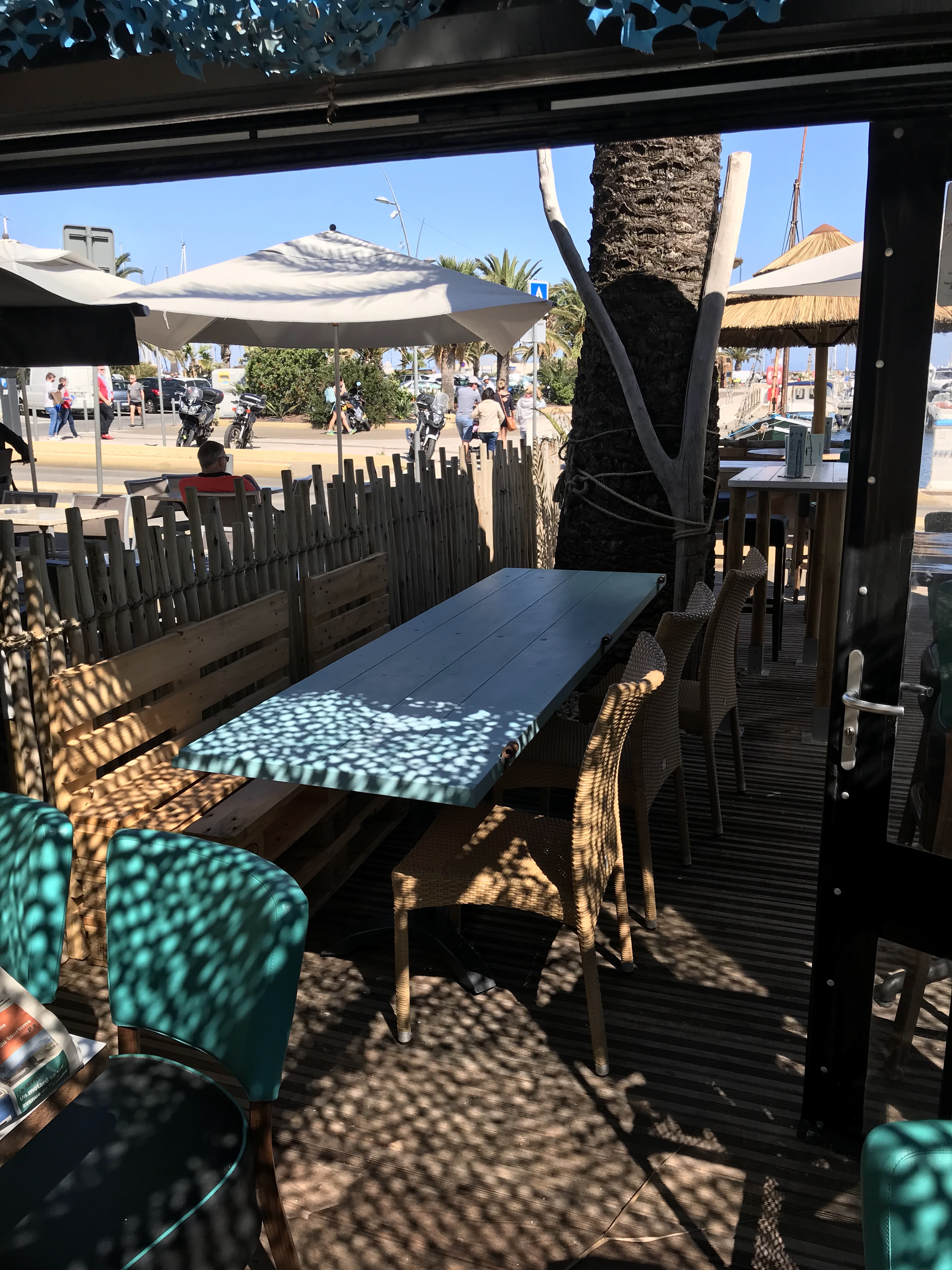 Je n’avais encore jamais été face a un tel sketch! Attente de presque 30 min pour que l’on vienne prendre nos commandes, et ce car j’ai gentiment interpellé une serveuse pour que ca se fasse. Un serveur qui arrive tres sur de lui genre cow-boy, qui nous dit « bah alors qu’est-ce qu’il se passe ? on est pressé? on a pas envie d’attendre? » Autant dire qu’il a deja mis le ton. Je precise que nous n’etions pas impatient, mais 30 min sous 32 degrés c’etait deja assez.. Ma belle-soeur commande par la suite un poulpe, ce meme serveur lui indique qu’il le lui deconseille car tres cher pour ce que c’est, une seule tentacule toute petite, et l’encourage a prendre des St Jacques, elle accepte, puis il dit finalement « ah non en fait j’en ai plus », il lui dit donc « je vous conseille plutot la daurade » avant de revenir pour indiquer qu’il n’y en avait pas non plus. Bref, apres avoir été tres c** (pour ne pas dire shooté car on voyait bien qu’il n’etait pas lui-meme), il n’y avait plus rien sur leur carte. Nous decidons de partir, il nous retient en disant que la commande des boissons qui allait arriver devait par contre etre reglée, alors que nous n’en n’avions pas touchée une, histoire d’etre commercial jusqu’au bout. En voyant notre refus, il a essayé d’appeler ses collegues pour nous intimider, avant qu’une serveuse s’interpose et nous laisse partir. Elle semblait desolée, c’etait bien la seule. Bref aucun professionnalisme, aucune amabilité, rien sur la carte, des plats que meme les serveurs nous deconseillent, et un serveur pas net. Le kiff ! Passez votre chemin les voisins sont bien meilleurs en tout point